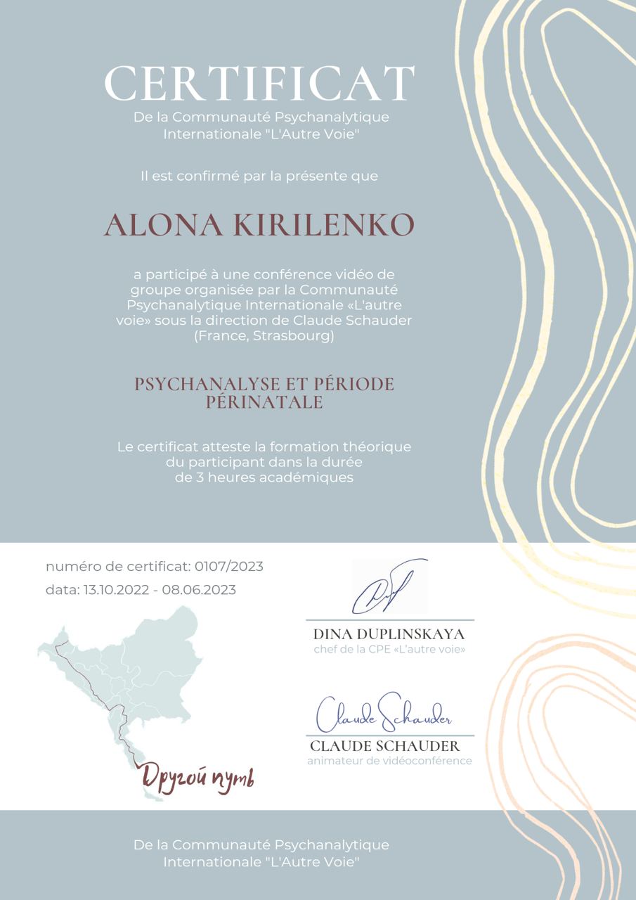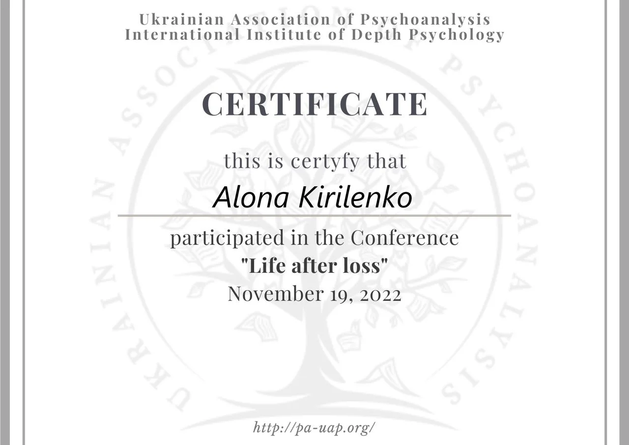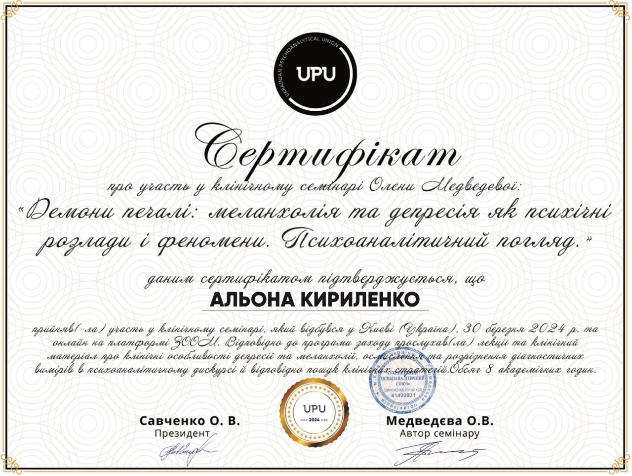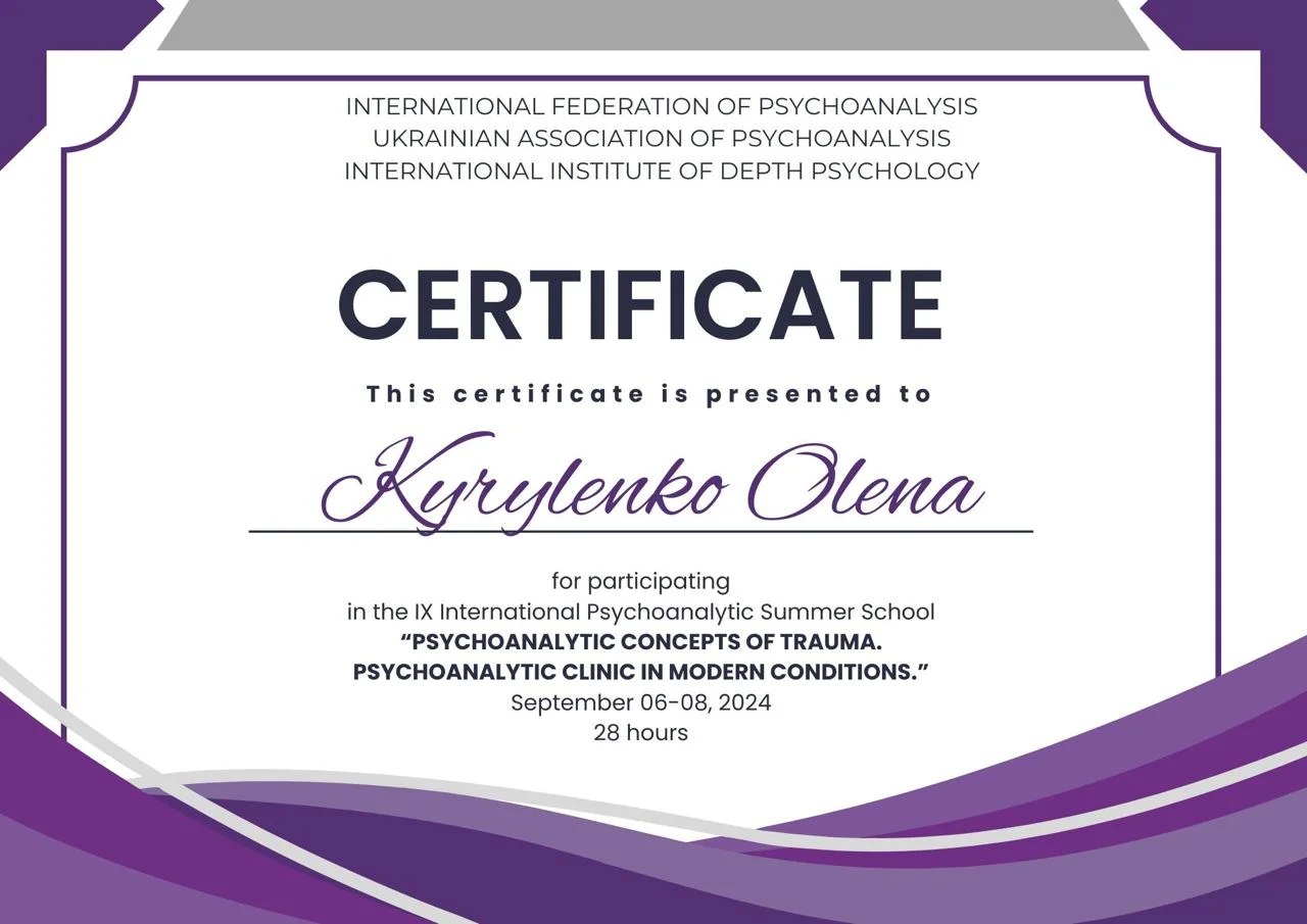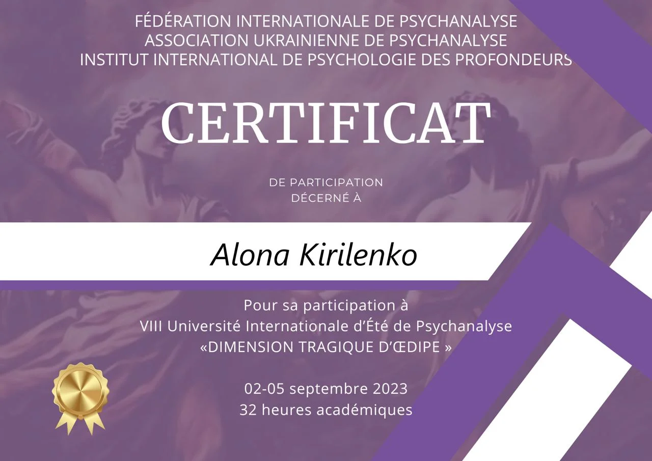 Проходжу тренінговий аналіз (особистий психоаналіз) у сертифікованого спеціаліста та тренінгового психоаналітика УАП-ЄКПП Україна (більше 300 годин, який триває).