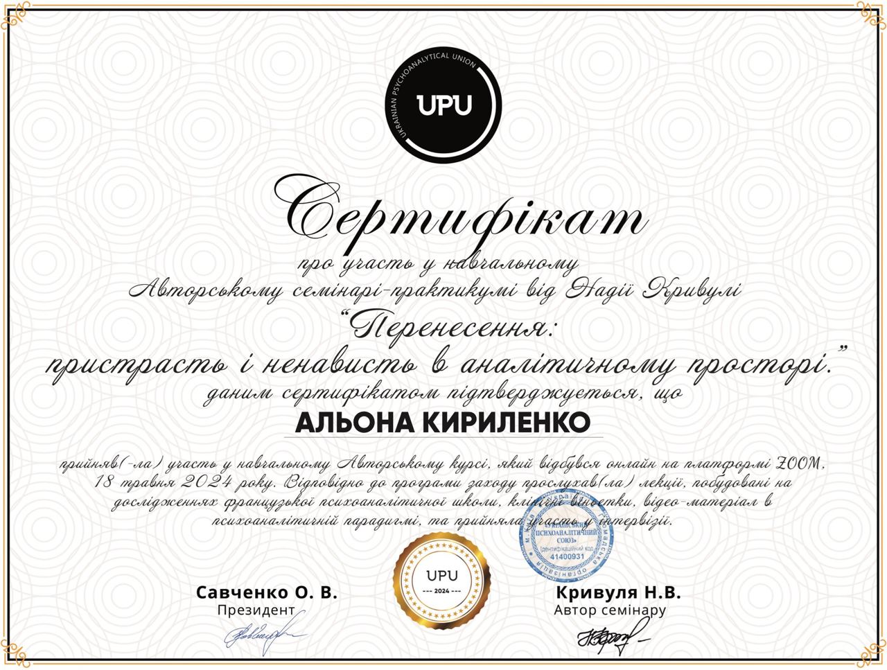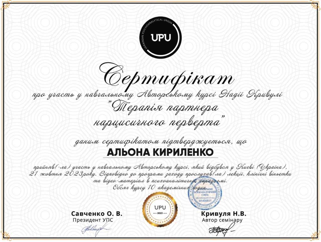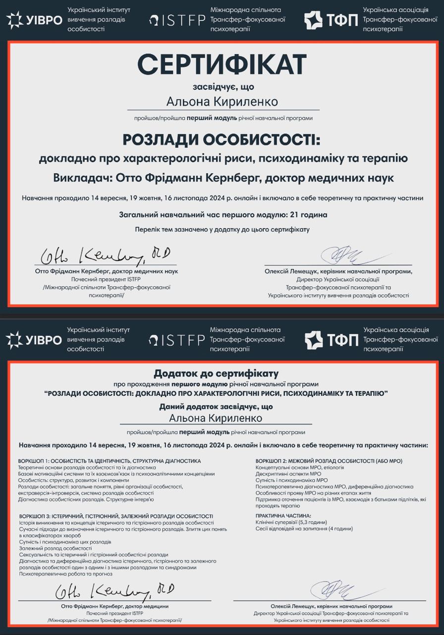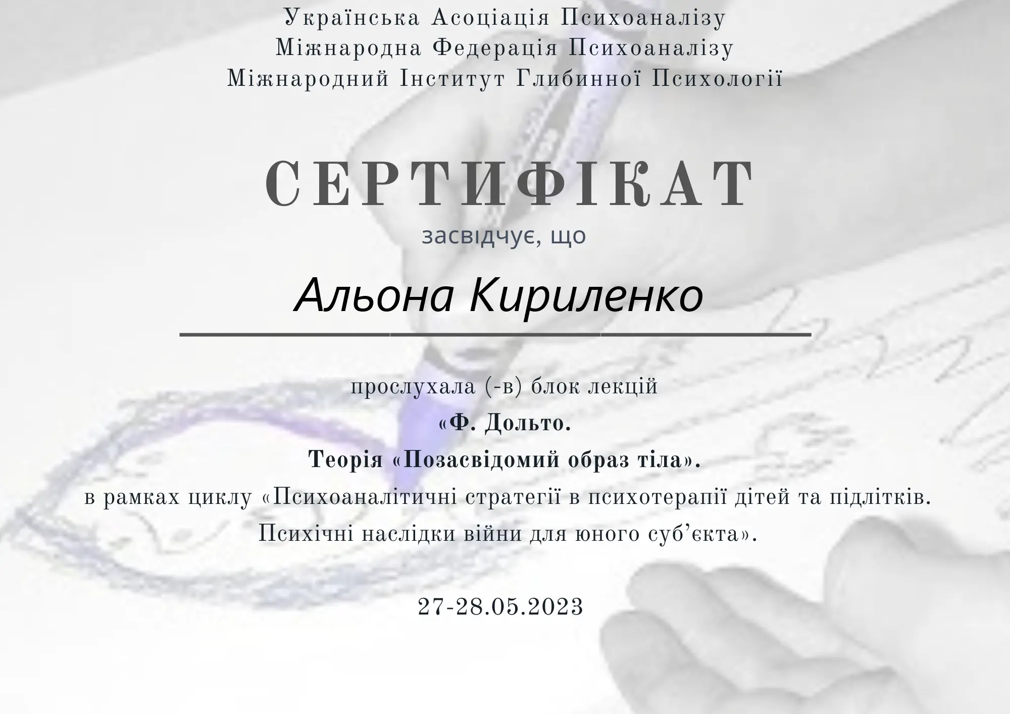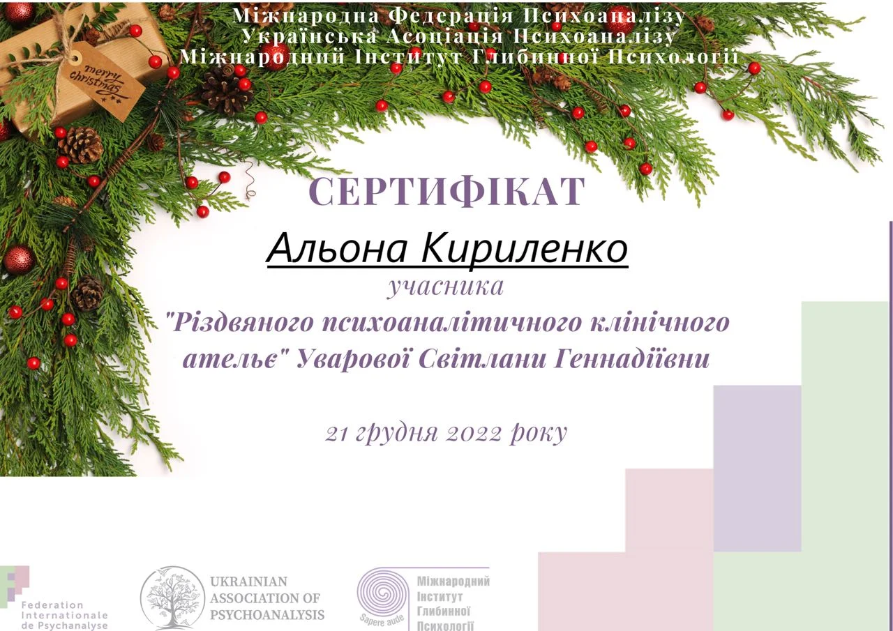 Проходжу тренінговий аналіз (особистий психоаналіз) у сертифікованого спеціаліста та тренінгового психоаналітика УАП-ЄКПП Україна (більше 300 годин, який триває).