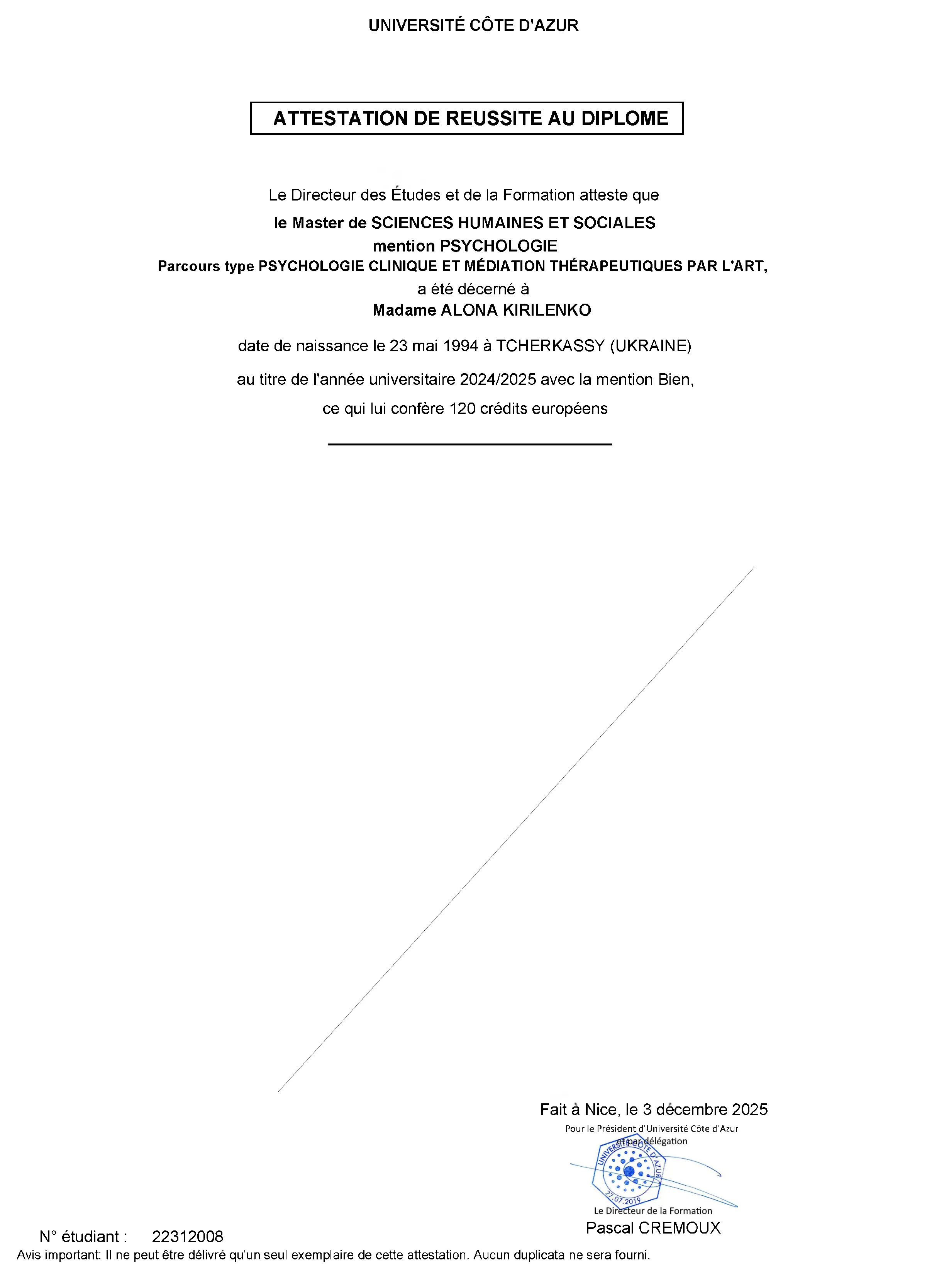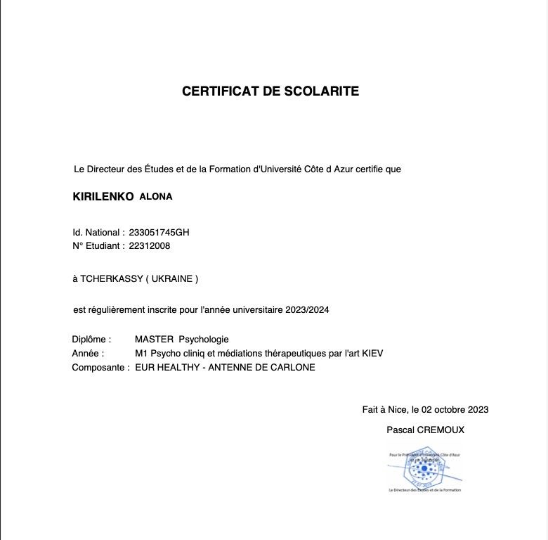 Закінчила магістратуру університету Кот-дʼАзюр (Ніцца, Франція), спеціальність - практична психологія, спеціалізація - Клінічна психологія і терапевтична медіація за допомогою мистецтва.
