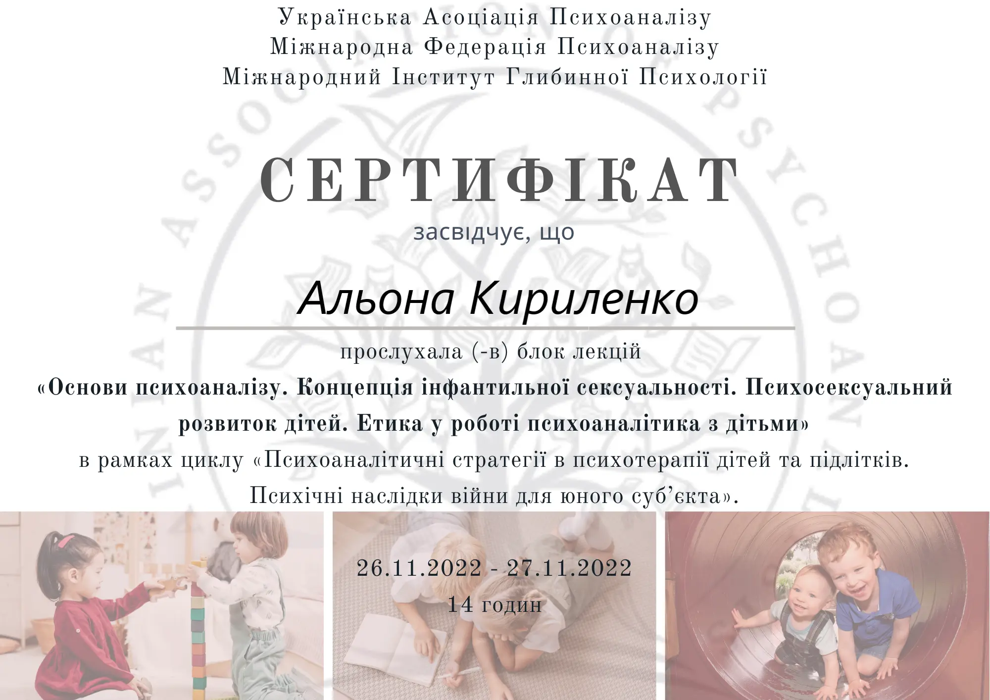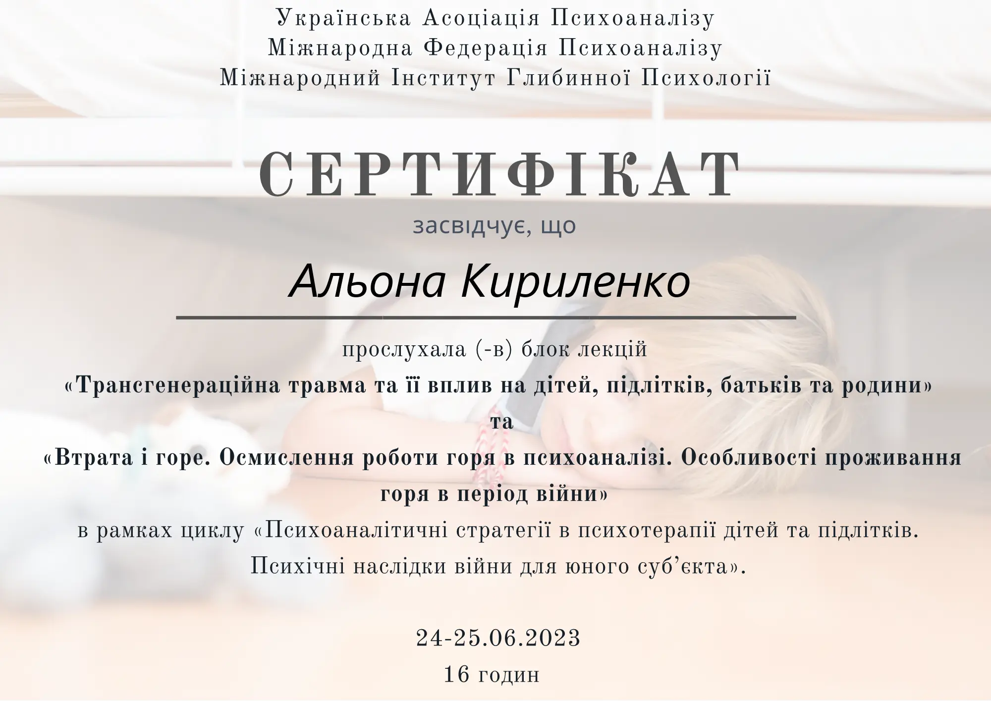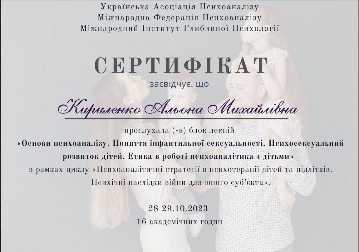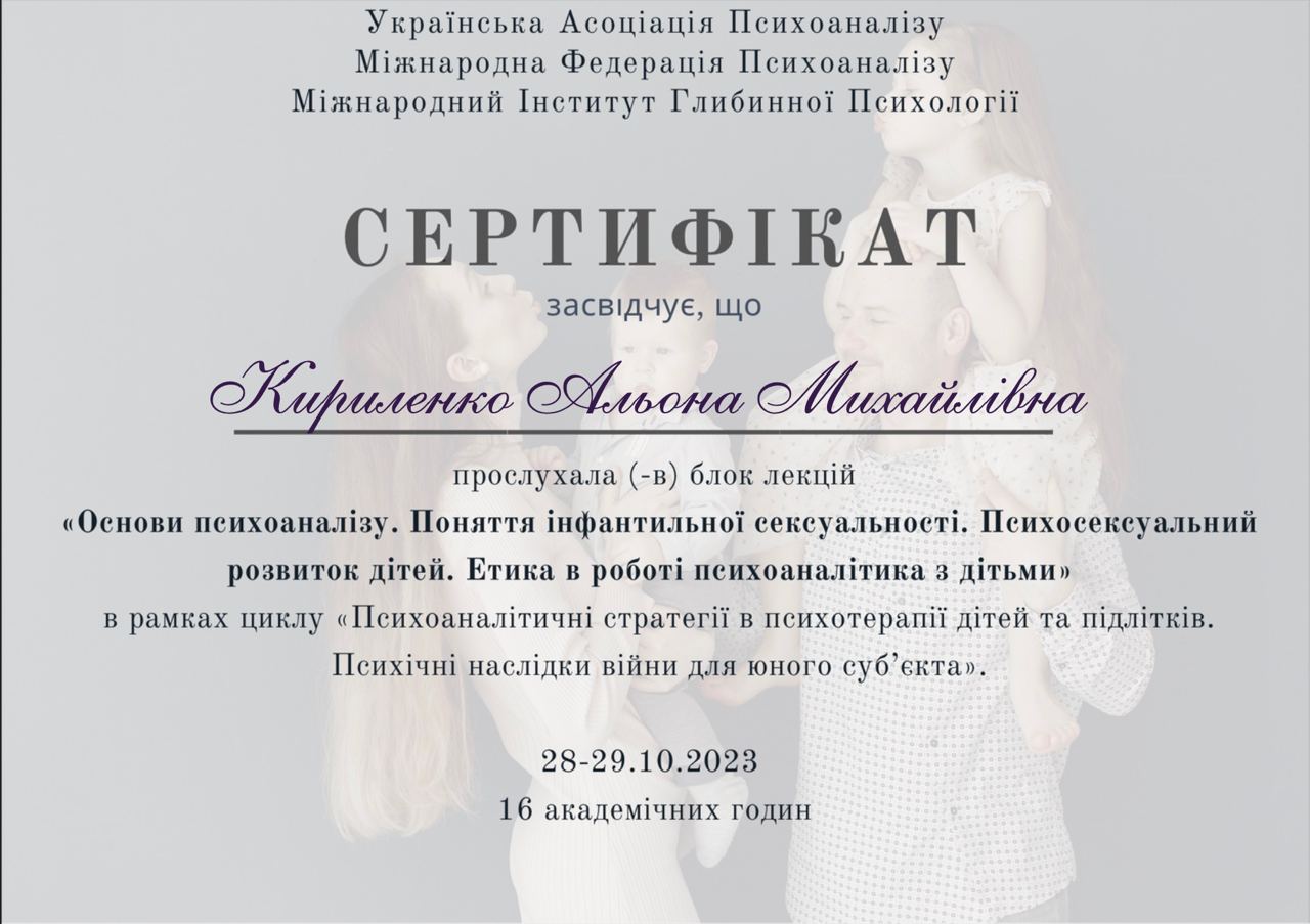 Клінічна спеціалізація «Психоаналітичні стратегії в психотерапії дітей та підлітків. Психічні наслідки війни для юного субʼєкту» (128 годин)